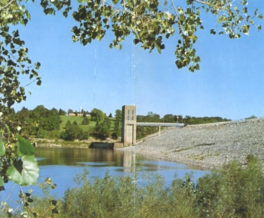 At a location several miles upstream from Iowa City, construction of the dam began in 1949, was delayed by the Korean Conflict, and was finally completed in 1958. Coralville Dam regulates runoff from 3,084 square miles of land upstream providing flood protection to 1,703 square miles of Iowa River Valley below the dam. During drought conditions, water stored in the lake is released at a minimum rate of 150 cubic feet per second (cfs) to provide a sufficient flow to meet downstream domestic and industrial water needs.