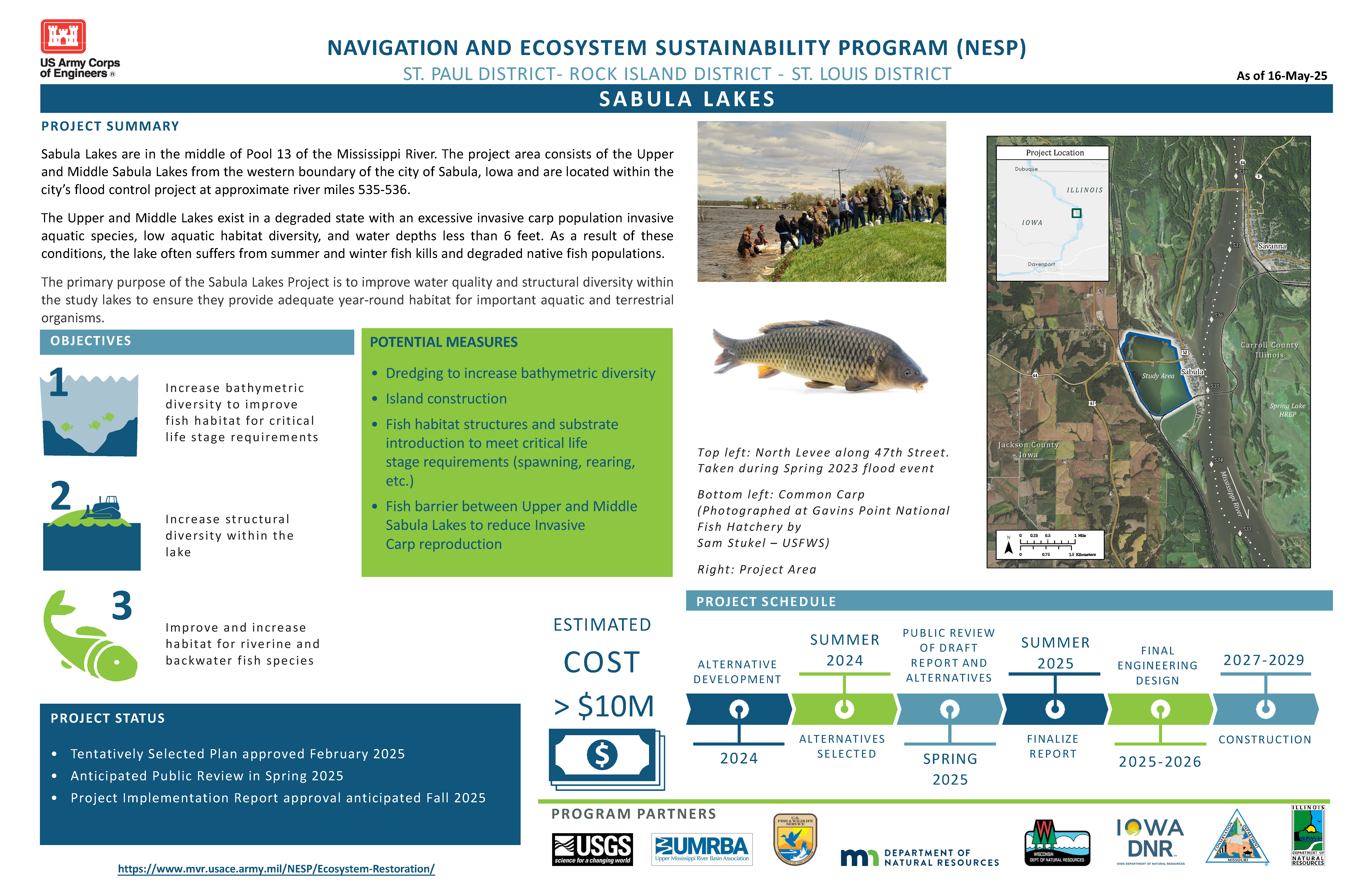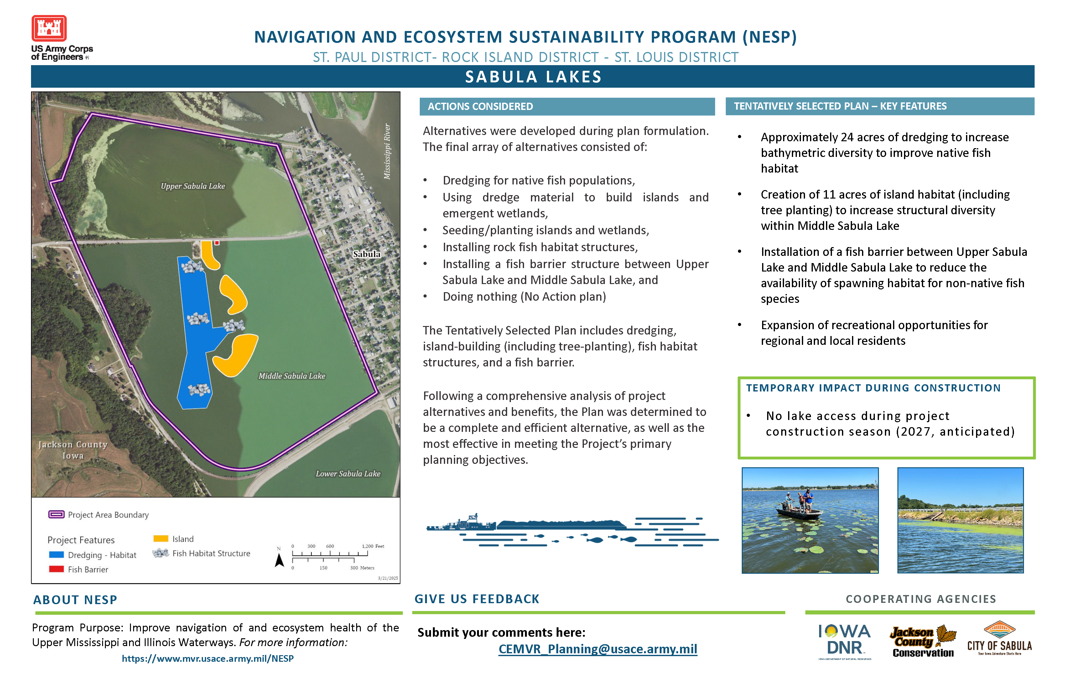 The Sabula Lakes project is a habitat restoration effort designed to improve water quality and structural diversity in the Upper and Middle Sabula Lakes in Pool 13 of the Mississippi River.